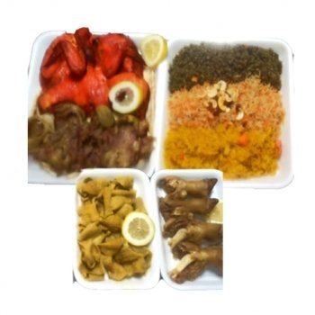 وجبة عرض ضريح كامل لسان وتلحيمة و فروجة كاملة و صفط كرشة غير محشية 350 غرام اربع مقادم صفط كبير مشكل فريكة و مندي و برياني ( 1700 غرام ) و مكسرات وصلصة و توم