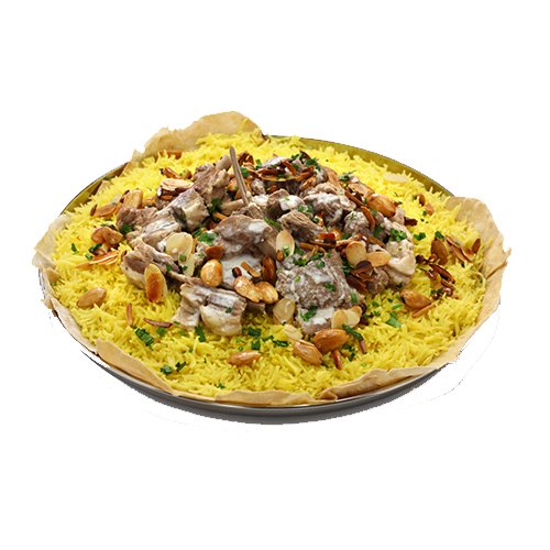 منسف برياني 1 كيلو لحم مشفى مع 1.6 كيلو رز مع صلصة و كريم ثوم و مكسرات