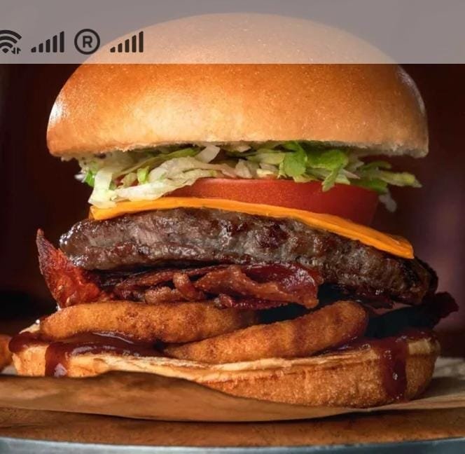 صدر دجاج + خس + كبيس + بندورة + بصل مقرمش + شدر شرائح + لحمة + بيكن بقر + باربكيو صوص